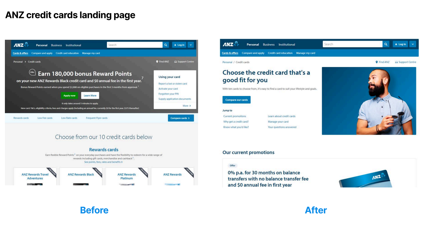 ANZ's credit card section hadn't been updated in years. The homepage was stale, the information architecture was cluttered with underperforming category pages, and the conversion journey had too much friction. Credit cards are the most heavily regulated part of the website, meaning any changes typically require weeks of stakeholder and legal approval, making quick optimisation difficult.